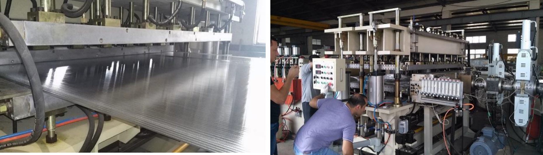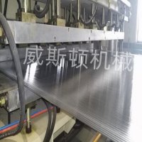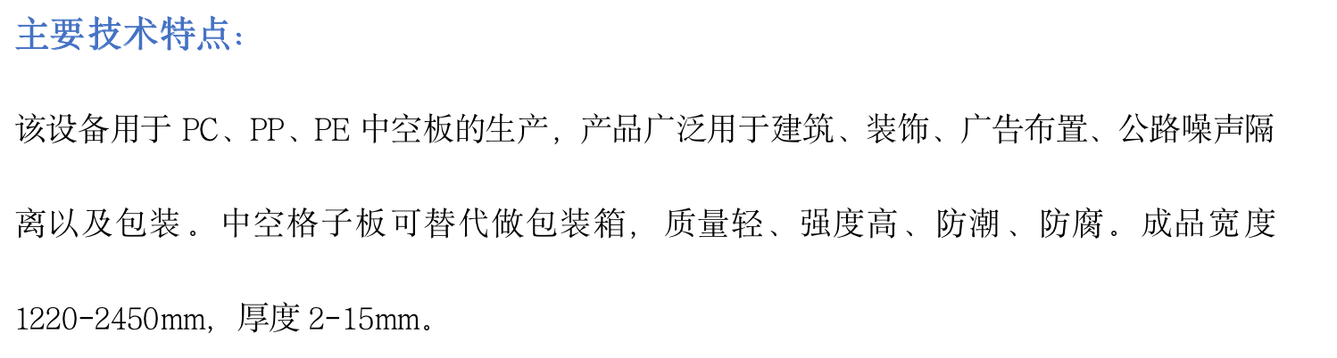 该设备用于PC、PP、PE中空板的生产,产品广泛用于建筑、装饰、广告布置、公路噪声隔离以及包装。中空格子板可替代做包装箱,质量轻、强度高、防潮、防腐。成品宽度1220-2450mm,厚度2-15mm。